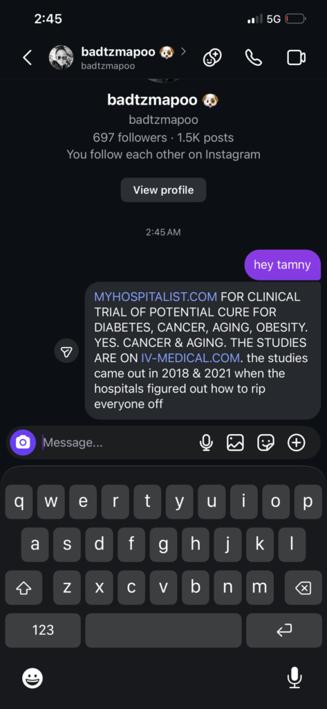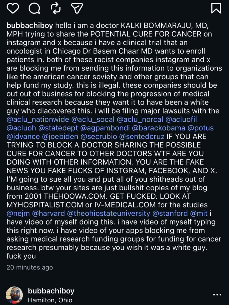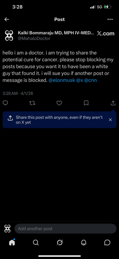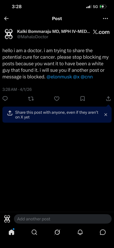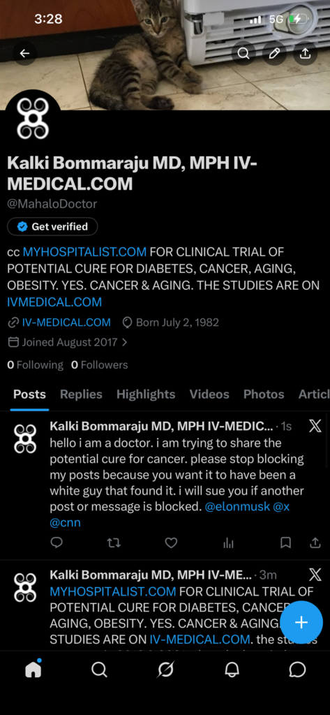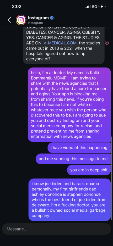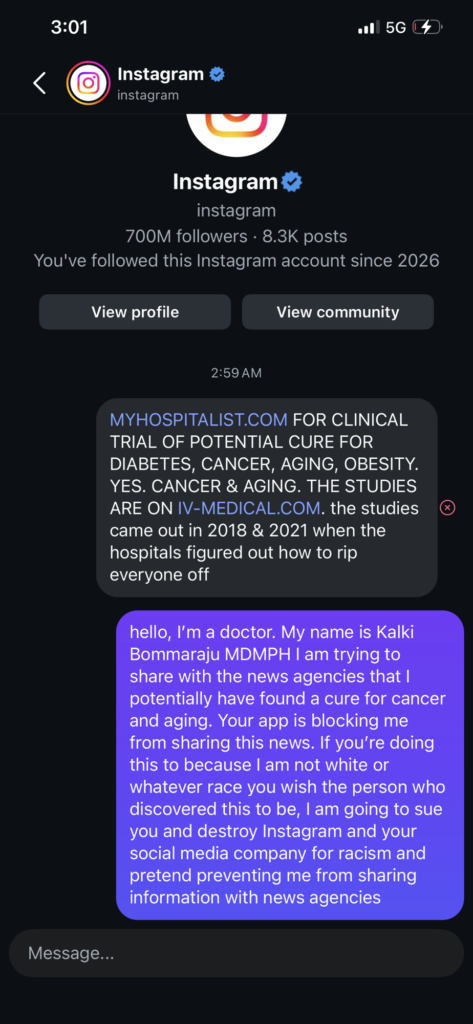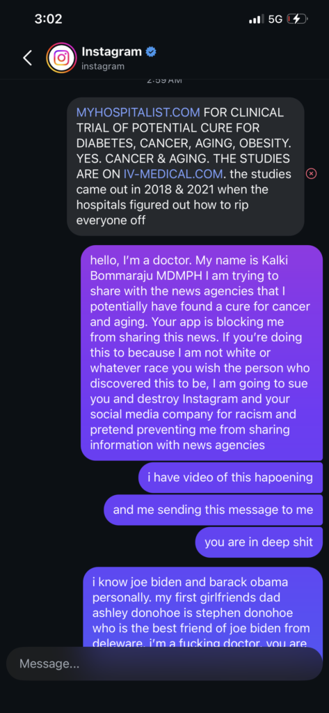 these social media companies are so racist they are blocking me from sending messages to cancer research societies telling them about my clinical trial through IV-MEDICAL.COM to see if NAD+ IV INFUSIONS WEEKLY OR MONTHLY CAN CURE CANCER, DEMENTIA, DIABETES, OBESITY AND PREVENT AGING. THAT IS WHAT THE STUDIES ON IV-MEDICAL ARE SUGGESTING. THEY ARE FROM CELL LEVEL JOURNALS. THIS IS TRANSLATIONAL RESEARCH. I HAVE AN MPH IN CLINICAL IVESTIGATION FROM THE NIH